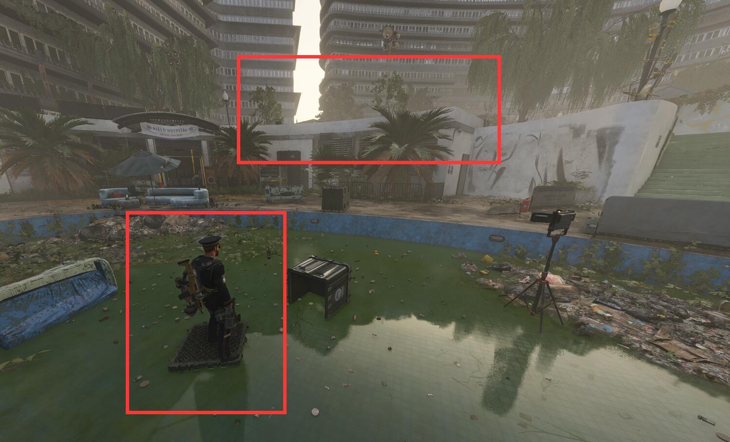 找到如下图所示的水潭后,在上面使用动作“开合跳”(默认动作使用键位是H键),2个猎人会同时出现在上方红色方块所示的屋顶上。